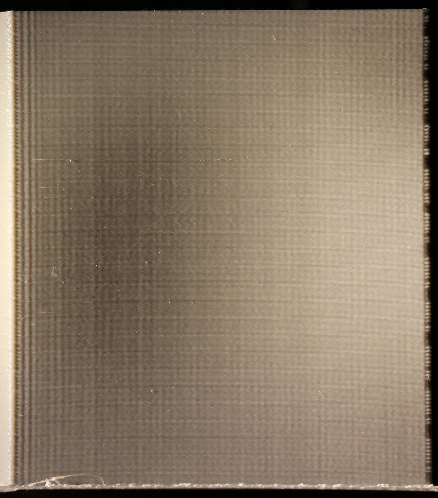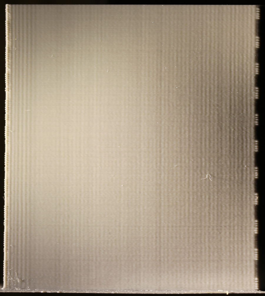 The peak at 0.1 mm is the layer height, because layer edges are not rectangular, but curved, so the walls are slightly thinner where layers bond. This peak as well as most short wavelengths next to form kind of a noise floor which I attribute to resistance in the axis bearings. The spindles have considerable mechanical play and the build bed is only held down by its considerable weight. The giant peak at 7 and 8 mm dominates and can be recognized visually when viewing the image from a distance. I suspect the cheap trapezoidal spindles to cause that, because the periodic errors from the pulleys are all very different. The maximum brightness deviations are +- 20%, which means at 0.1 mm layer height, around +- 2/100 mm. The specification of common trapezoidal spindles allows way more than that! Again the gradient forbids analysis of larger wavelengths, but the result is reasonable up to 10 mm wave length.