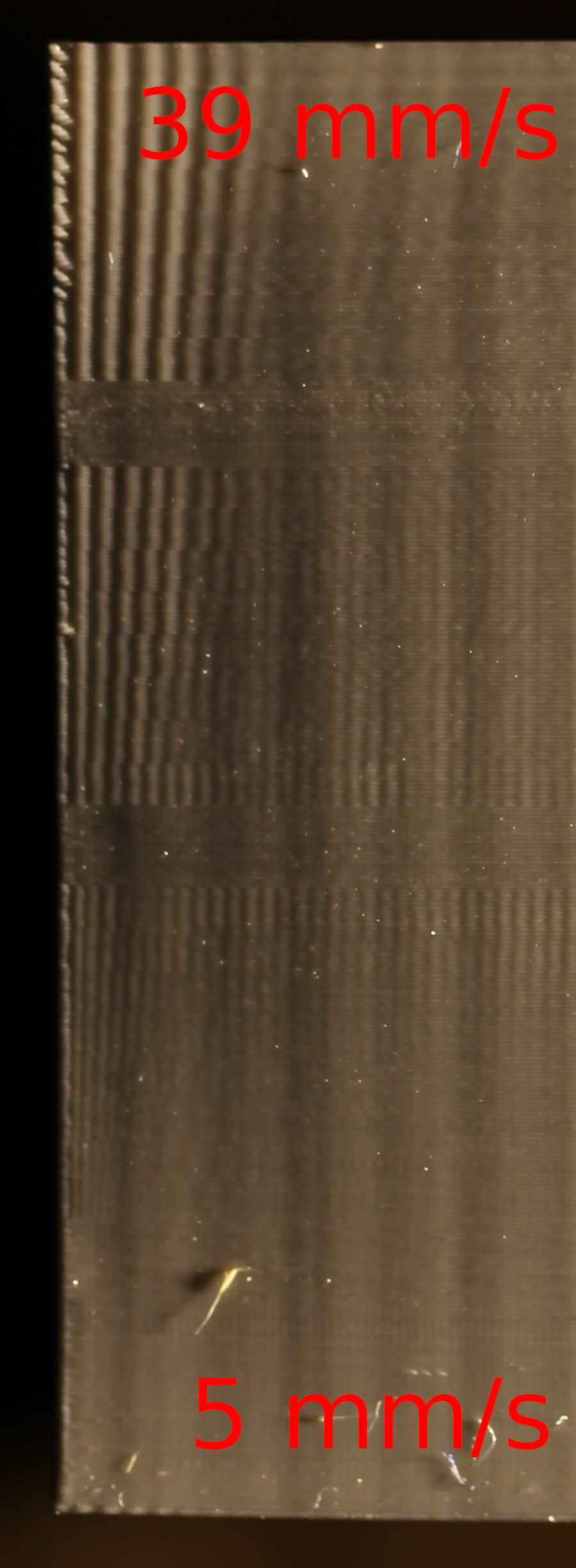 A 90 degree direction change shows the dampened vibration of the print head after the corner. The higher the speed, the more vibrations occur and the longer their spatial period is.