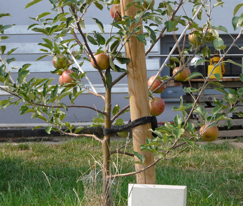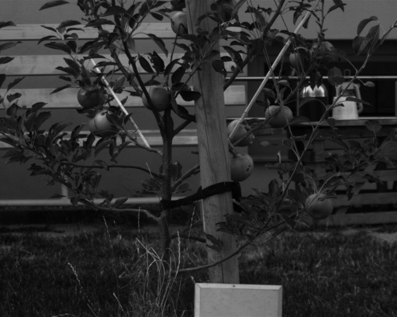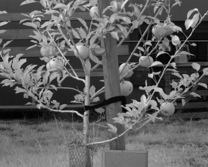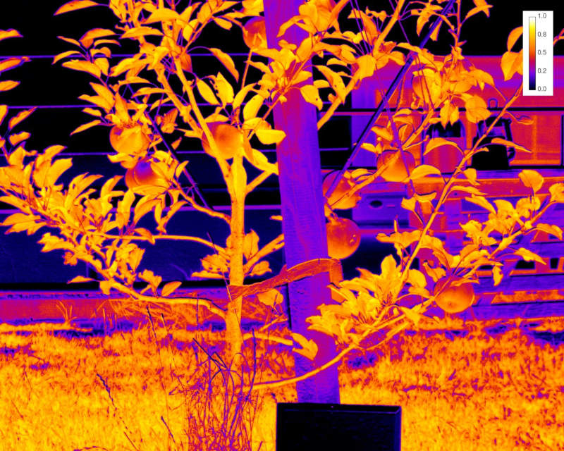 I was surprised to see high values for the branches, not only for the leaves, and much lower values for the sunny side of the apples. The low values for the wooden post are to be expected. Unfortunately, there is no standard NDVI palette, so I used "Fire" from ImageJ, which delivers good contrast. NDVI image: