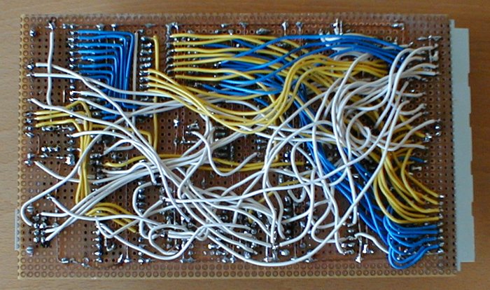 I checked the board did not contain a power shortcut, populated the chips and turned it on. Now I could tell how great it worked and everybody would think how cool I am - but I would lie. Since the CPU did not even enable the multiplexer, I could tell fetching instructions failed. Rather quickly, I found a shortcut between A14 and Vcc. I did not see it, but could measure it, and resoldering the ROM jumpers fixed it. Still no response from the board, but at least it enabled the multiplexer now. Using a logic probe, I saw the UART got accessed, but could not tell more. I built a single step circuit and attached it, which showed the program accessed the UART exactly when it should, but something was wrong, because it did not react. I saw /WR and /CS active, but together? Logic probes can't tell (my next one will have a trigger), so I built a latch with some LEDs, attached that to the board as well, and soon I saw the UART /CS was not active when /WR was. The decoder worked fine, but the address bus did not. This time, it was a minor but important drawing mistake in the schematics, so I fixed the schematics by exchanging the connection to P2.6 and P2.7, then fixed the PCB, and finally the SBC booted up. The front shield and the I2C chips are still missing above.