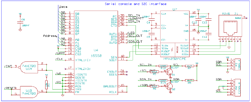 As you can see, with 6 MHz baudrates above 9600 will not work, but that suffices. The level shifter is the usual MAX232 application, but with a MAX232ACPE to avoid electrolytic capacitors that take space and don't last forever. The connector is not DSUB, as you might expect, but RJ45 with Cisco pinout, which is made to connect any two devices with always the same simple 180 degree twisted flat cable - a console cable. Serial connections never were easier.