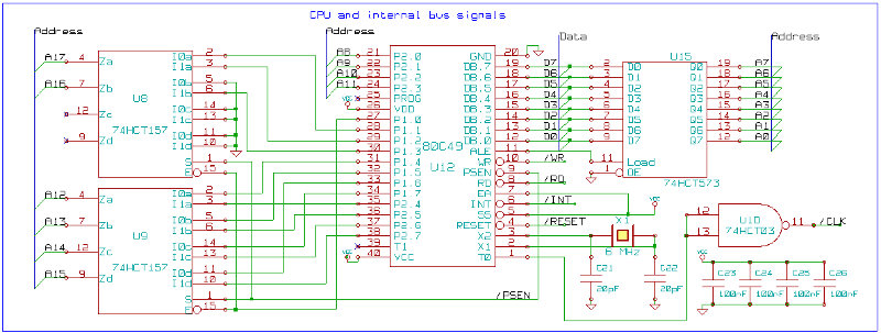 Code addresses are 12 bit wide and data addresses are even shorter: Just 8 bit. That may suffice for small controlling application, but I wanted more. Extending the data address space is easy, because P20-P23 is used as A8-A11 during program access, but as port any time else and in particular during a data access, so simply use P20-P23 as A8-A11 without any latches and you get the data space extension from 8 to 12 bits for free.