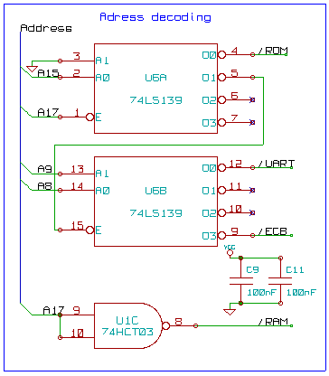 Anything beyond requires banking, but since there are two segments, two independent bank selectors are needed. That asks for multiplexers, controlled by /PSEN. After reset, the multiplexer must be inactive. One solution would be a flipflop, triggered e.g. by a write access to ROM space to avoid the need for a port, but that means you could not get back to the state after reset. I decided to use P10, because it is high after a reset, just right to control /E of a multiplexer. P24-P27 are just natural as A12-A15 for data accesses, leaving P11-P17. I decided to use P14-P17 as A12-A15 for code accesses (just for symmetry), which leaves P11-P13. Three bits give me A16 and A17 for data, and A17 (no A16!) for code, because I figure I need more data than code. All in all, code can use P2 like a page pointer for data accesses, but P1 is a typical bank switching control port and accesses to it should be rare. If the multiplexer is not enabled, IO can still be accessed, just upper memory is not available. Note: There is a bug in the drawing and the PCB. P1.6 and P1.7 need to be exchanged. You will not notice that with programs as small as the provided firmware, but with larger ones.