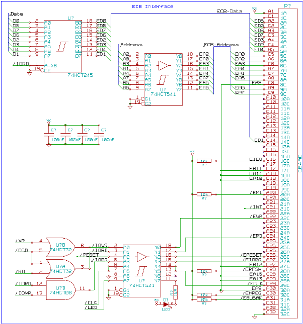 The entire address room is filled with memory onboard and the ECB interface is only used for external I/O accesses. As already mentioned, the range 8300-83ff is mapped to external I/O addresses 00-ff. A8-A15 on the ECB interface are tied to GND.