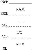The RAM is mapped to the top half of the address room. The upper half of the RAM can not be used as program storage, because A16 of the code segment selector is tied to ground for lack of port pins. The I/O area is not fully decoded and consists of four parts: