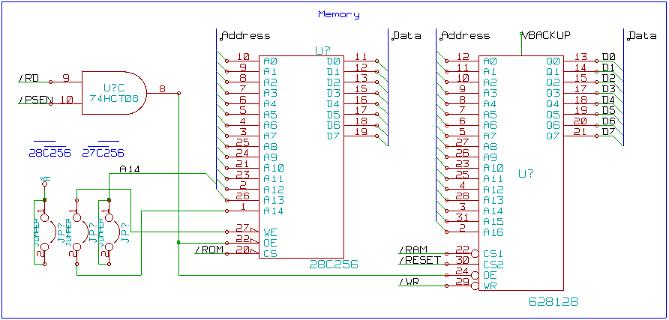 The memory subsystem is very straight. ROM is a 32kx8 EPROM or EEPROM, the latter being easier to program, but more expensive. A jumper field allows to select which one you want to use. RAM is a 128kx8 low power SRAM. It is battery backed by connecting its power supply to battery backed power and CS2 to /RESET, saving a NVRAM. Both memories serve program and data accesses by combining /RD and /PSEN. Note that the MAX690 has about no voltage drop, which is important for the SRAM which only allows signals to be 0.3V above Vcc. A schottky diode may not suffice.