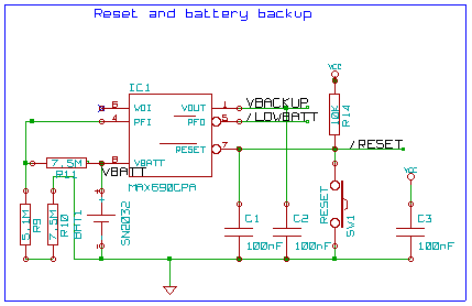 Many designs save the switch and simply use a Schottky diode to connect a RAM to Vcc. Unfortunately, many RAM parts ask for signals not to exceed Vcc plus 0.3V to avoid getting damaged. In the real world, the diode works, but it is easily outside the spec. I want things to work as reliable as possible and the MAX690 has a ridiculous low voltage drop. Its /RESET is also perfect, which is important, because it is active on battery backup and fed to unpowered chips. You wouldn't want a regular low of up to 0.8V being fed to unpowered parts. There is one trap, though: Unless you need a very small fanout, you need a pullup resistor for /RESET, because the builtin resistor is pretty large.