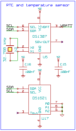 When I changed the design to I2C for the RTC, I felt using an I2C temperature sensor would be sensible. The DS1621 is available as DIP8, although as expensive as the TSic206 and not as precise. If you want to save some money, then solder a LM75 to an adapter and use that instead: Their pinout is compatible, just the software needs some small changes. Older socket 7 boards usually contain a LM75 below the CPU and that's where I got mine, too. If you want more precision, use the LM75AD from Philips, which offers 11 bit instead of 9, or the ADT75 from Analog Devices, which offers even 12 bit.