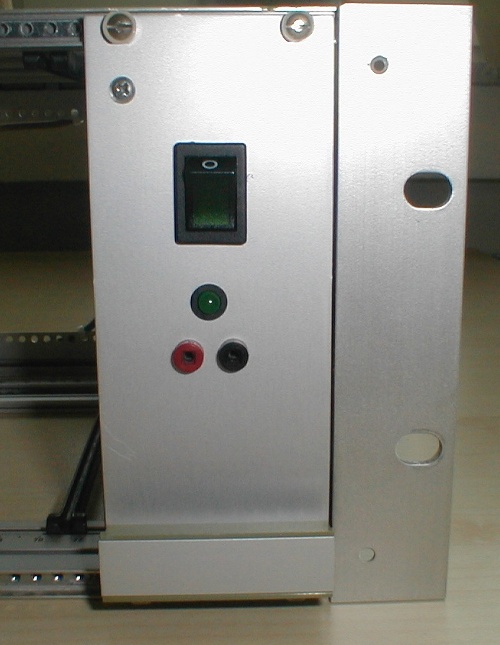 A cheap frameless power supply mounted to a lab card with a simple front plate.
